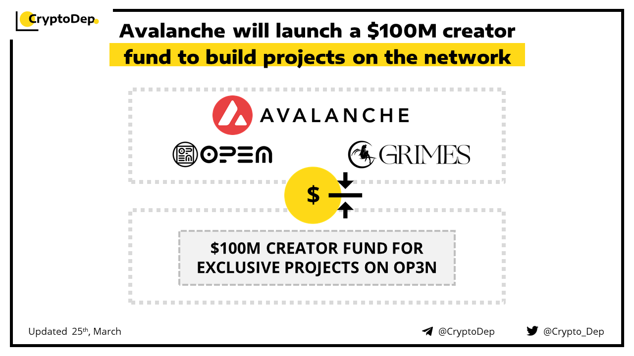 Avalanche launches $100 million creator fund with Grimes and web3 platform Op3n. Funds will be used to launch projects on the network exclusively accessible on fledgling social media platform Op3n. This initiative represents a chance to increase Avalanche's cultural cache in a world where Ethereum and Bitcoin dominate public perception of crypto.
