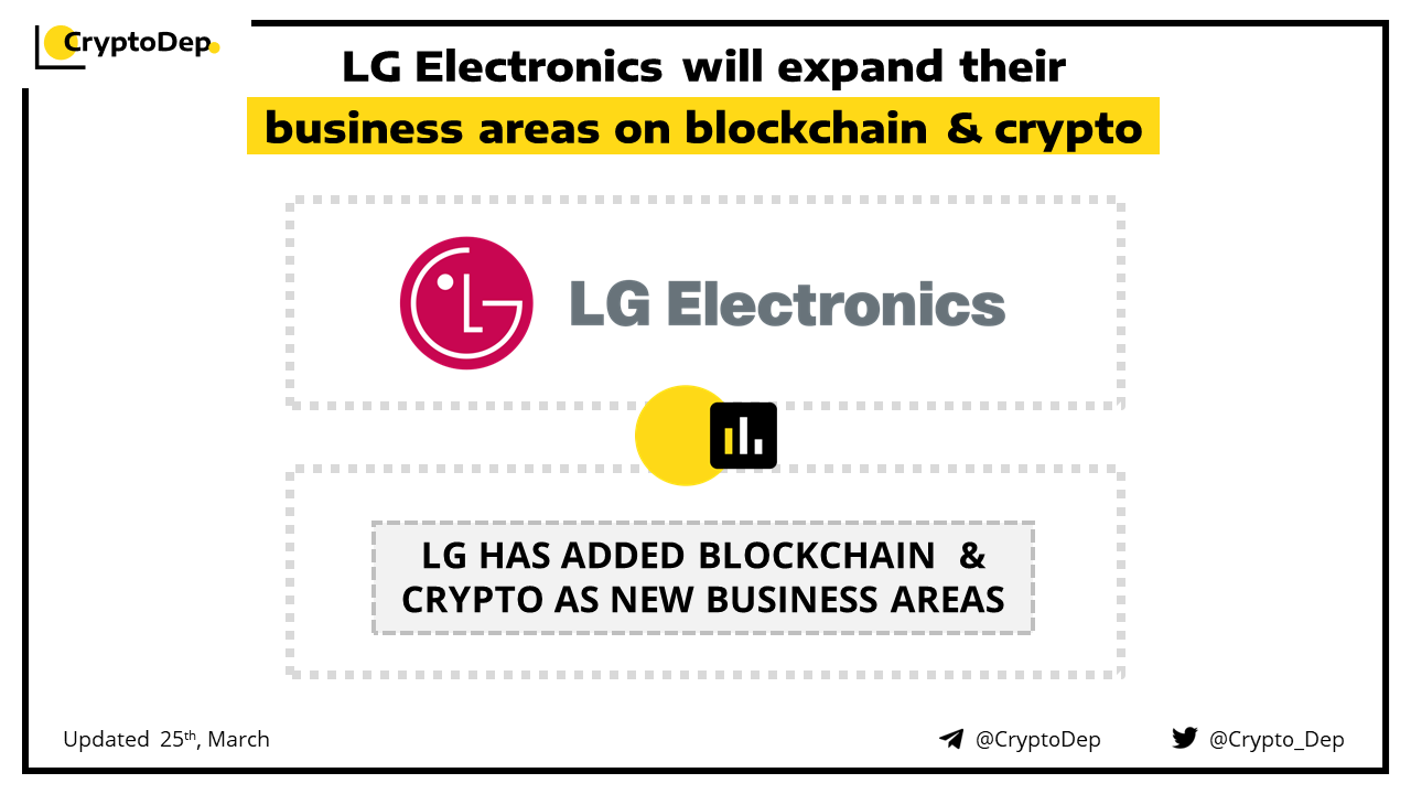 LG Electronics, a South Korean tech giant has officially added blockchain and cryptocurrency as new business areas in its corporate charter. The objectives include βthe development and selling of blockchain-based softwareβ and βthe sale and brokerage of cryptocurrencyβ. LG also announced a partnership with Seoul Auction Blue, an online art auctioneer, to carry out further projects related to NFT-based artworks.
