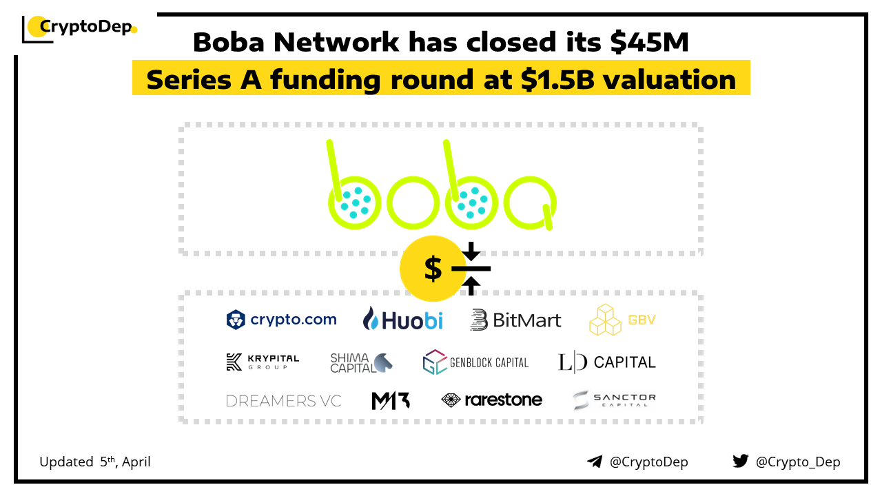 Boba Network, the Ethereum Layer-2 scaling solution and hybrid compute platform, has raised $45M in Series A funding round, at $1.5B valuation. Among investors: Crypto com, Huobi, BitMart, Hypersphere, Infinite Capital, Hack VC, GBV, Alliance DAO, The Venture City, Sanctor Capital, Shima Capital, DeFi Tech, 10X Capital, TRGC, D1, Portal, Genblock, Rarestone, Krypital, and others.