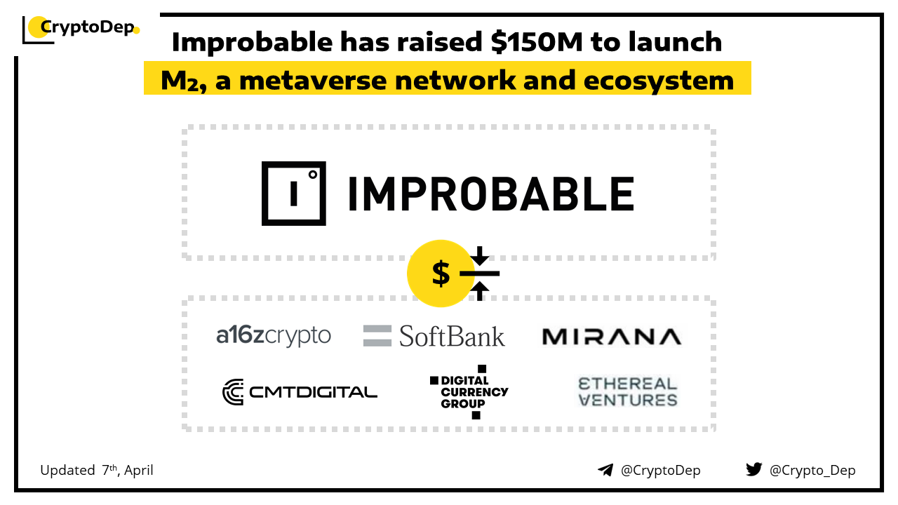Improbable, the UK-based metaverse technology company, announced today it has raised $150M in funding to establish and develop MΒ², a network of interoperable Web3 metaverses powered by its Morpheus technology. Funding round was co-led by Andreessen Horowitz (a16z) and SoftBank's Vision Fund. Among other participants: Digital Currency Group, SIG, Mirana Ventures, Ethereal Ventures, CMT Digital.