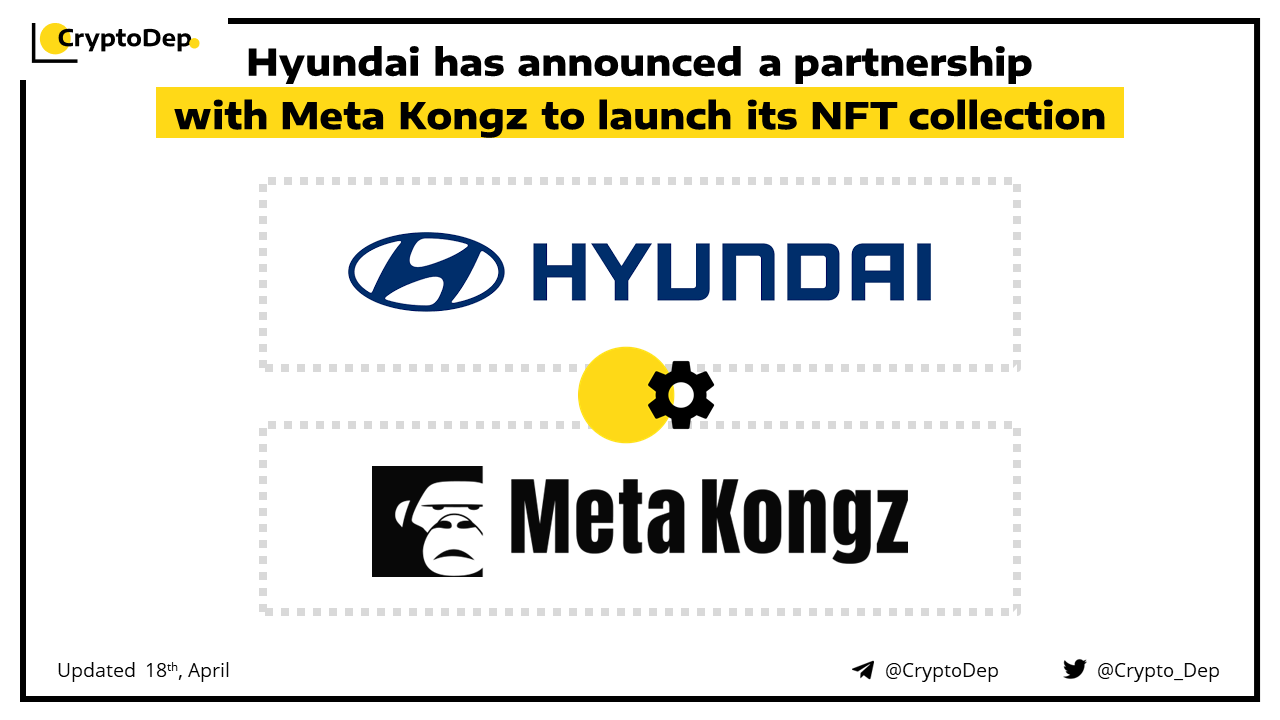 Hyundai has teamed up with Meta Kongz NFT project to create a limited collection of 30 NFTs coming in May 2022. Moreover, Hyundai's announcement included a teaser for a further βShooting Star NFT,β with a cryptic explanation that it is a βticket to a whole new worldβ and might lead to βnew NFTs.β Hyundai continued its concept, hinting at a possible βHyundai Metamobility universe,β a metaverse with the issuance of various NFTs as mobility vehicles.