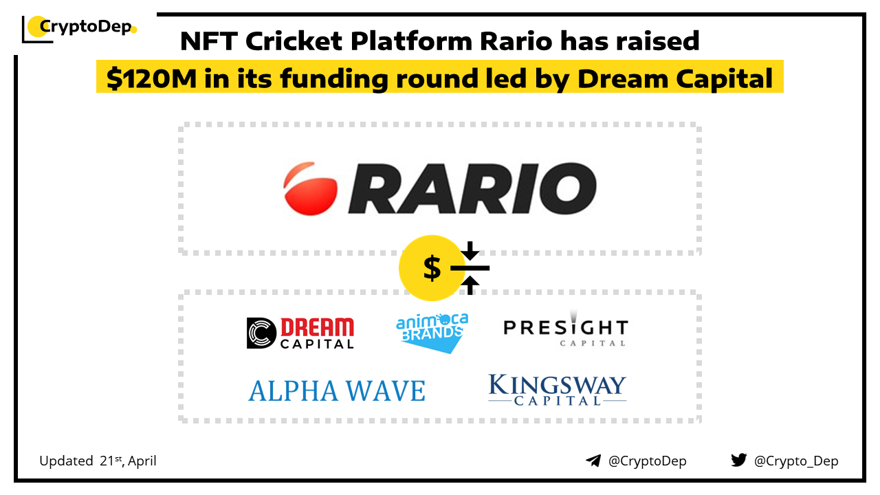Rario, an NFT platform for cricket, has closed its $120M Series A round led by Dream Capital. Besides investment, Dream Capital is partnering with Rario to help sports fans engage deeper with their favorite cricket teams. Other round investors included Alpha Wave Global, Animoca Brands, Presight Capital, and Kingsway Capital.