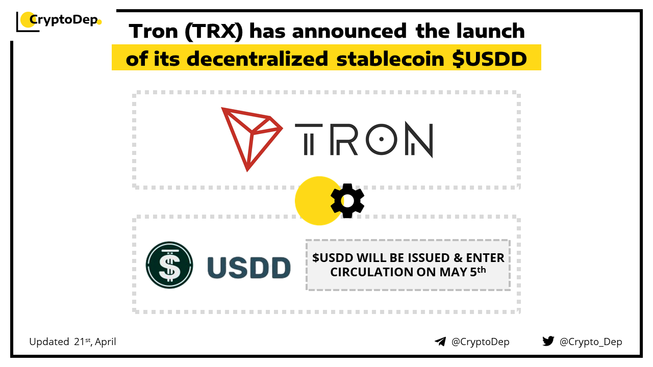 TRON DAO will launch USDD (Decentralized USD), jointly with major blockchain players on May 5th. By emission of $USDD, TRON aims to usher stablecoins into the 3.0 era led by the TRON-based USDD, which will not rely on any centralized institutions for redemption, management, and storage. Instead, it will achieve full on-chain decentralization.