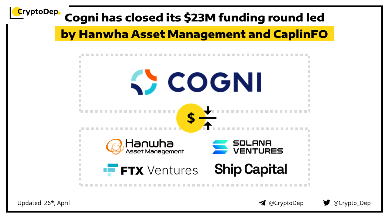 US neobank Cogni has raised $23M in a round led by Hanwha Asset Management and CaplinFO. Solana Ventures, FTX Ventures, and Ship Capital also participated in the round. Alongside the funding round, the startup announced that it will launch a multichain wallet and a savings account on decentralized finance rails.