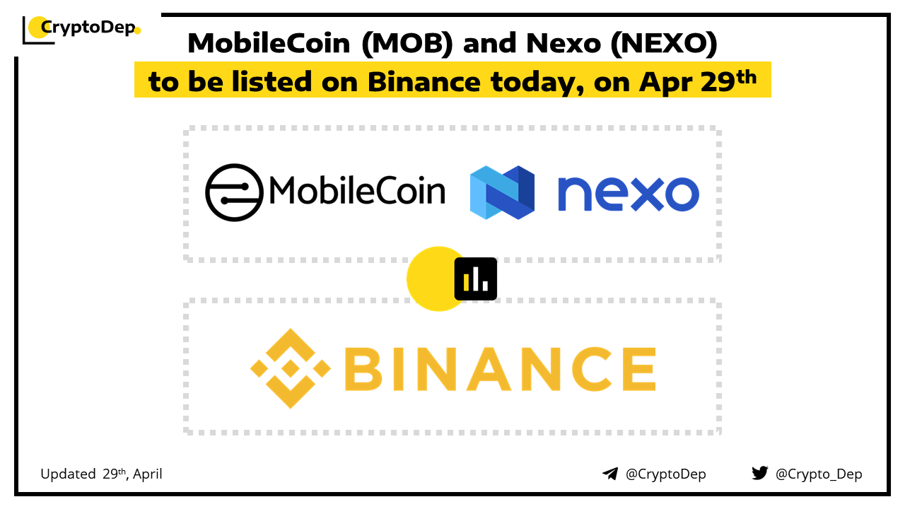 ββMobileCoin (MOB) and Nexo (NEXO) to be listed on Binance today, on April 29th