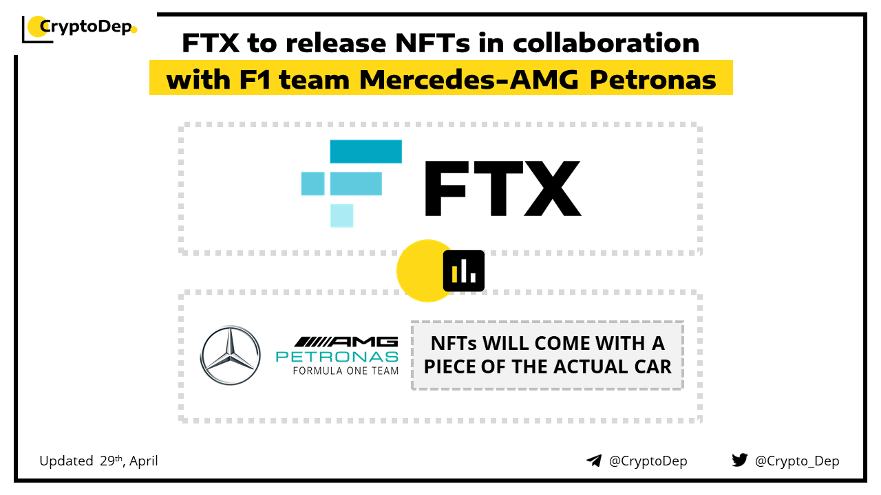 FTX and F1 team Mercedes-AMG Petronas will release NFTs in both free-to-claim and premium auction formats. By purchasing these NFTs users can own part of Lewis Hamiltonβs or George Russellβs F1 car with FTXβs NFTs for next weekendβs Miami Grand Prix.