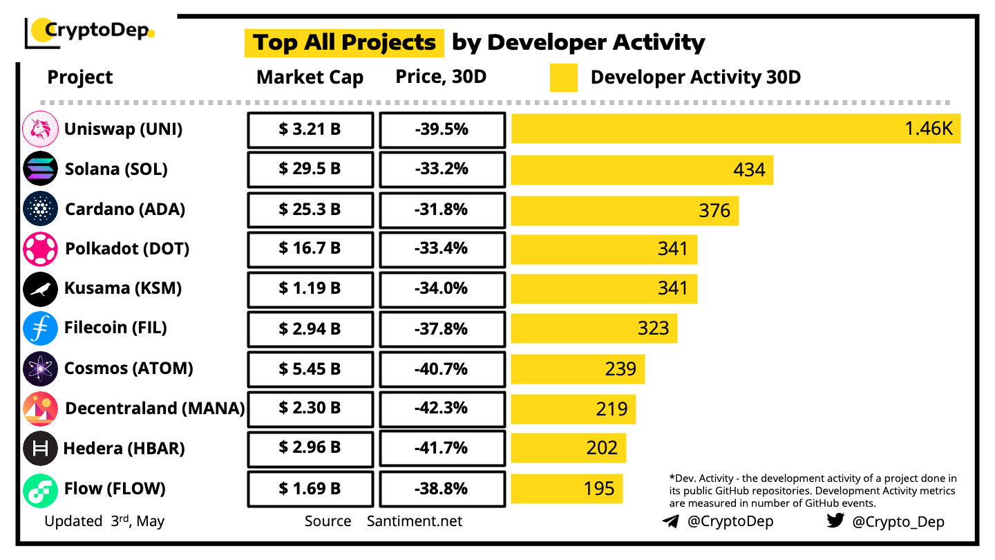 Dev.Activity - the development activity of a project done in its public Github repositories. Development Activity metrics are measured in number of Github events.