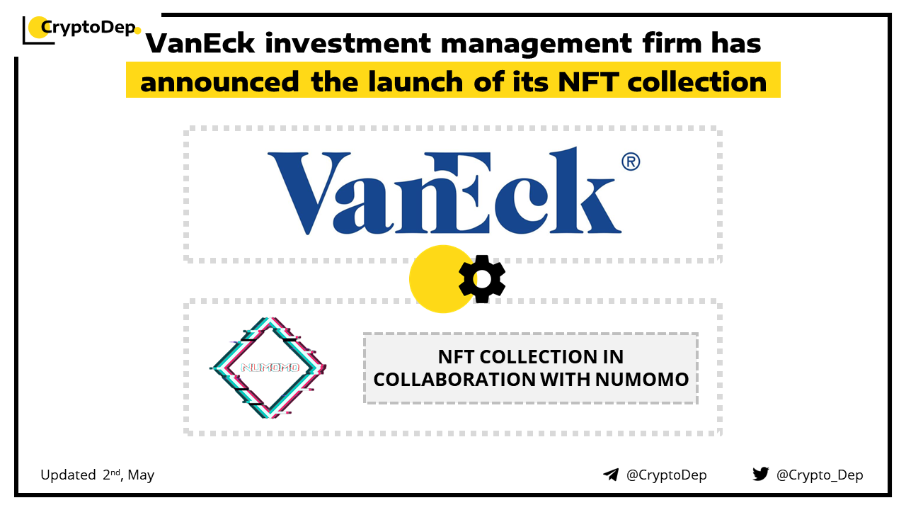 VanEck, a New York-based investment management firm, will release a collection of 1,000 NFTs in partnership with the NFT creative services firm NUMOMO. The collection will include three tiers: 750 βcommon,β 230 βrareβ and 20 βlegendary" NFTs. Each level will afford the owner more special access to VanEck events, digital asset research and other exclusive benefits. An airdrop to people who sign up for the project will occur the first week of May in 2022.