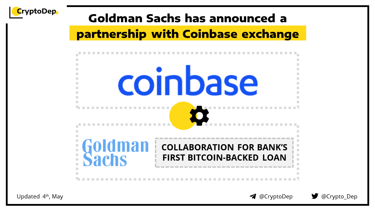 Through this partnership, the first bank's bitcoin-backed has been facilitated by Goldman Sachs. Coinbase borrowed an undisclosed amount of cash that was collateralized by bitcoin in a historic transaction from Goldman Sachs. Goldman previously introduced itself to bitcoin through a non-deliverable bitcoin option facilitated by Galaxy Digital.