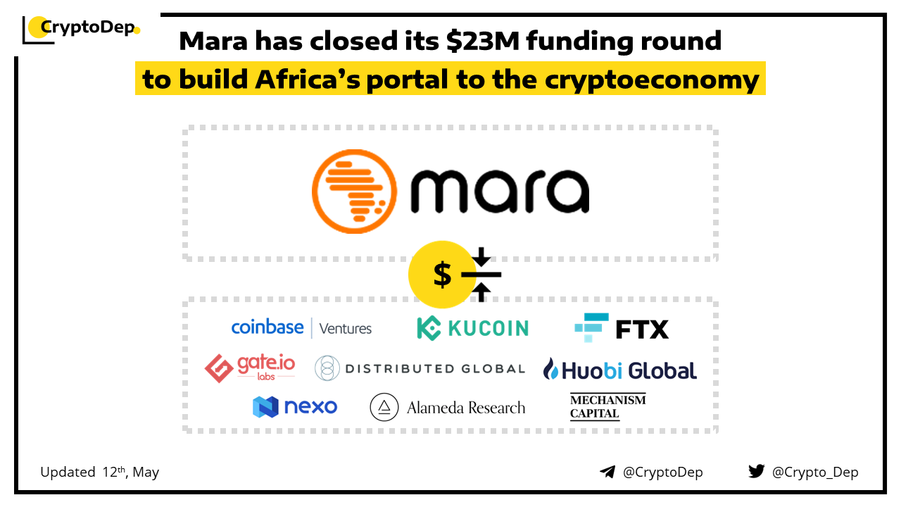 Mara, a Pan-African centralized crypto exchange, has secured $23M in its funding round. Among investors: Coinbase Ventures, Alameda Research, Distributed Global, TQ Ventures, Huobi Ventures, KuCoin Labs, Gate, Hashkey, Infinite Ventures, Mechanism, and Woodstock.
