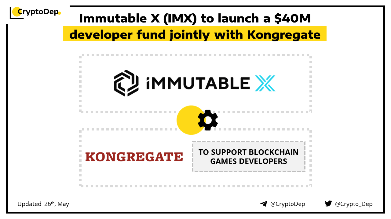 Immutable X has teamed up with web gaming platform Kongregate for a $40M fund to give grants to developers who make blockchain games for Kongregate. The fund consists of an IMX token pool that will be awarded as grants to blockchain game integrations. Kongregate is relaunching later this year to become a destination for blockchain games from both established and indie developers and home to a new generation of gamers.