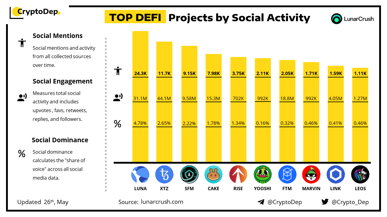 Social Engagement measures total social activity and includes upvotes, favs,retweets, replies, and followers.