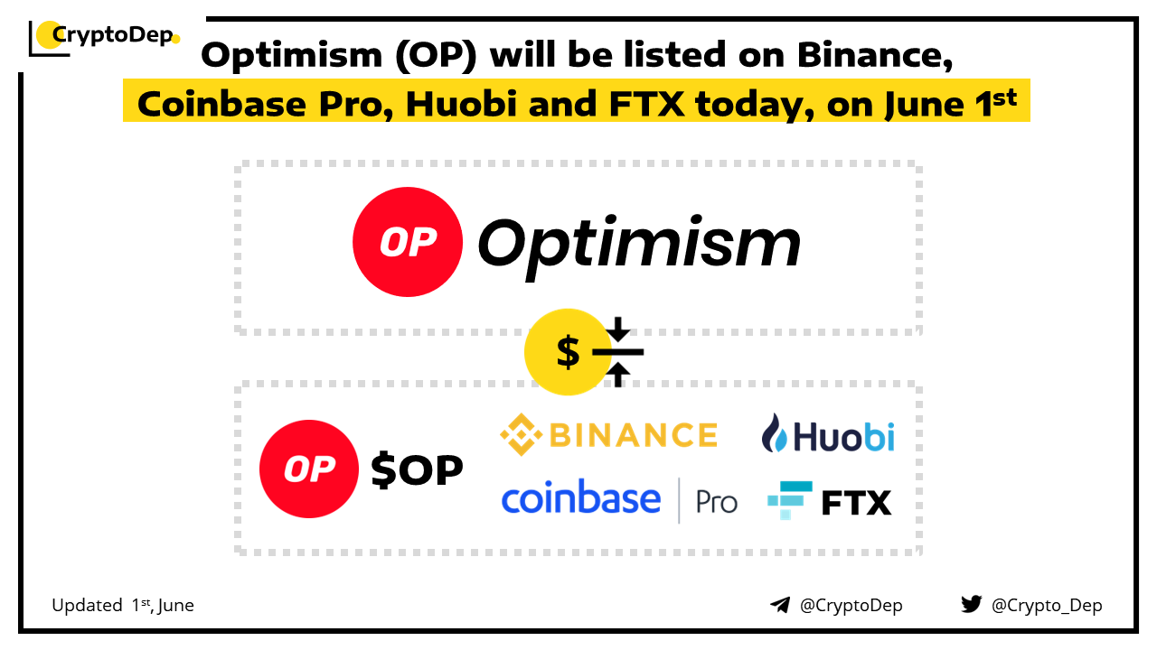 ββOptimism (OP) will be listed on Binance, Coinbase Pro, Huobi and FTX today, on June 1st