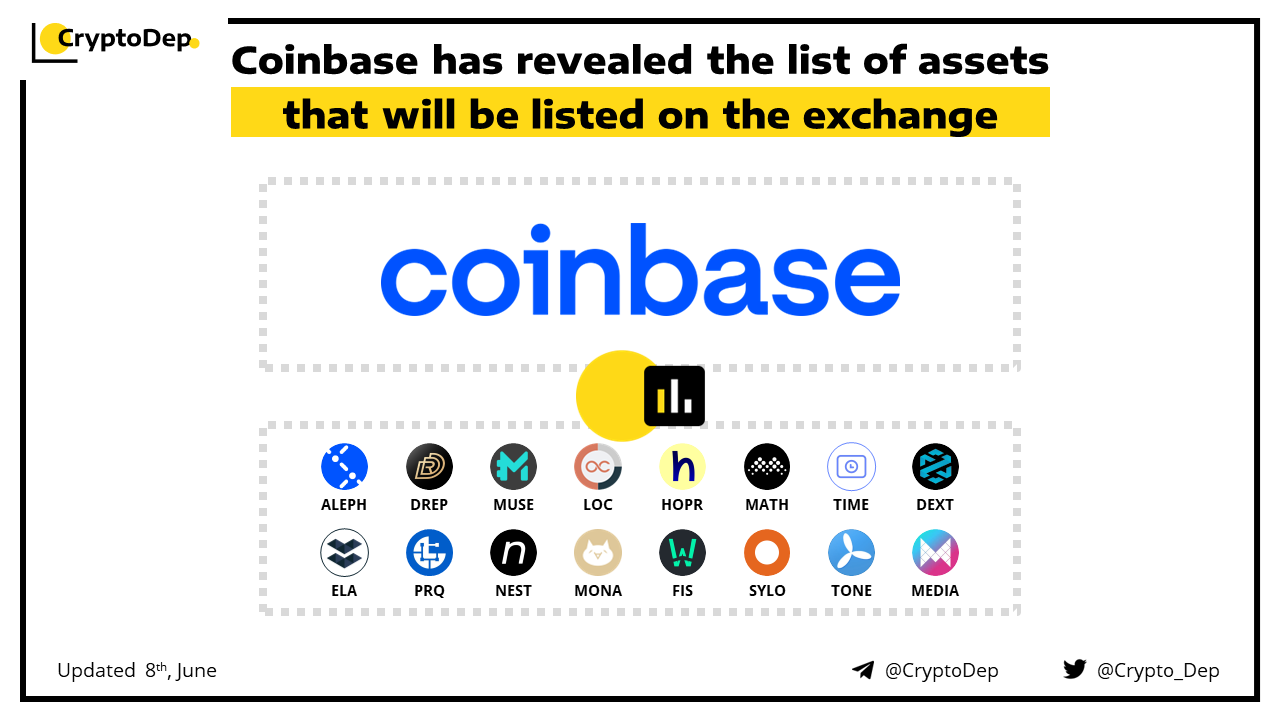 Coinbase has announced the list of upcoming cryptocurrencies' listings. Among projects: Aleph $ALEPH, Drep $DREP, Muse DAO $MUSE, LockTrip $LOC, HOPR $HOPR, MATH $MATH, chronotech $TIME, DexTools $DEXT, Elastos $ELA, Parsiq $PRQ, Nest Protocol $NEST, Mona $MONA, Stafi $FIS, Sylo $SYLO, TE-FOOD $TONE, and Media Network $MEDIA.