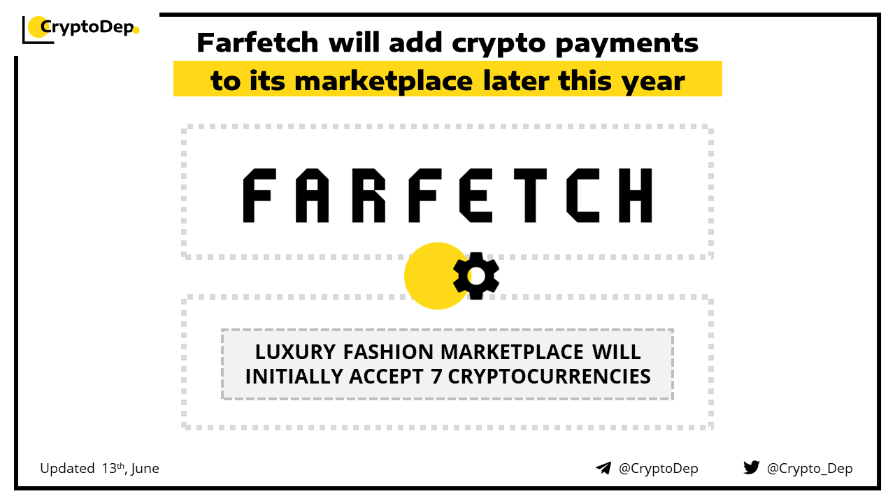 Farfetch, an online luxury fashion marketplace will begin accepting cryptocurrency payments later this year. Payments will be available within seven acceptable currencies including Bitcoin (BTC), Ethereum (ETH), Binance Coin (BNB), among others.