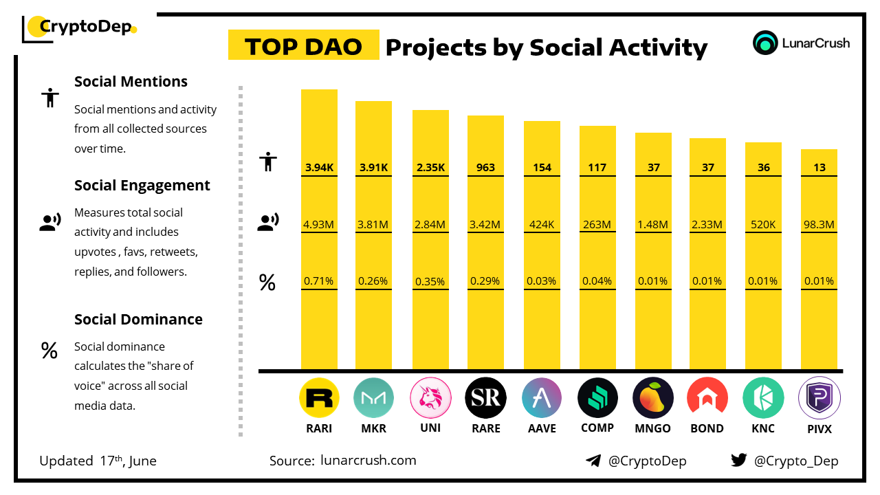 Social Engagement measures total social activity and includes upvotes, favs,retweets, replies, and followers.