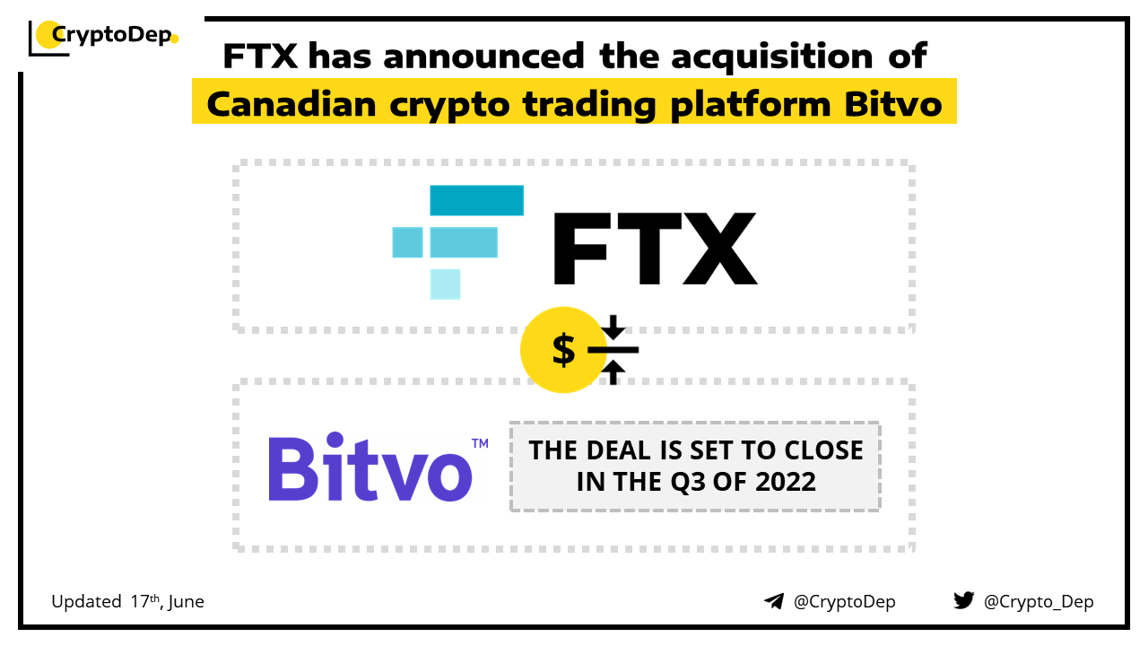 FTX acquires Canadian crypto trading platform Bitvo as the cryptocurrency exchange continues to add to its global treasure chest of acquisitions. The deal is set to close in the third quarter of this year on the condition it receives regulatory approval. Bitvo is a Canada-based platform that enables users to trade digital assets, including BTC and ETH among others.