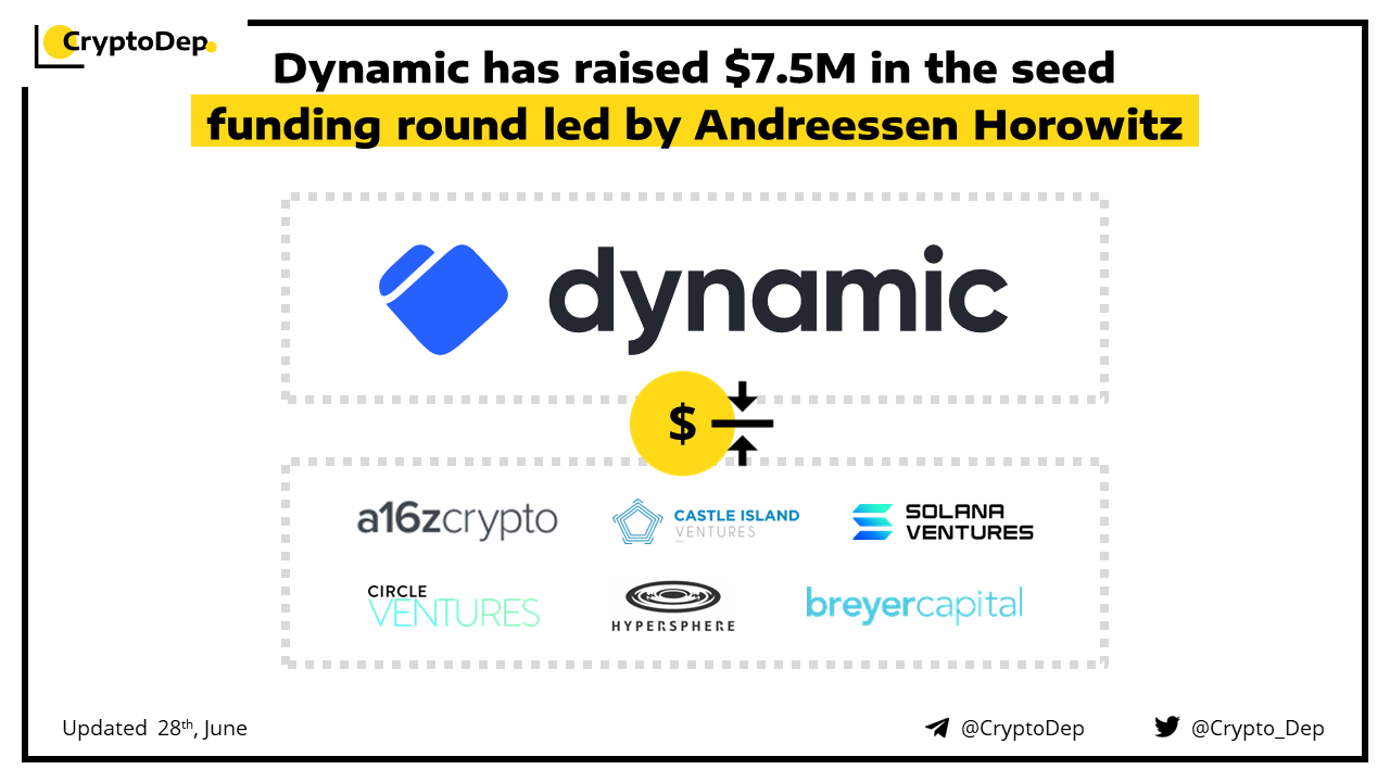 Dynamic, a multi-chain wallet-based authentication and authorization platform, has raised $7.5M in a seed funding round led by a16z. Among investors: Castle Island Ventures, Solana Ventures, Circle Ventures, Breyer Capital, Hypersphere, Chapter One, and others. Dynamic aims to serve different types of startups and companies in both web2 and web3 space.
