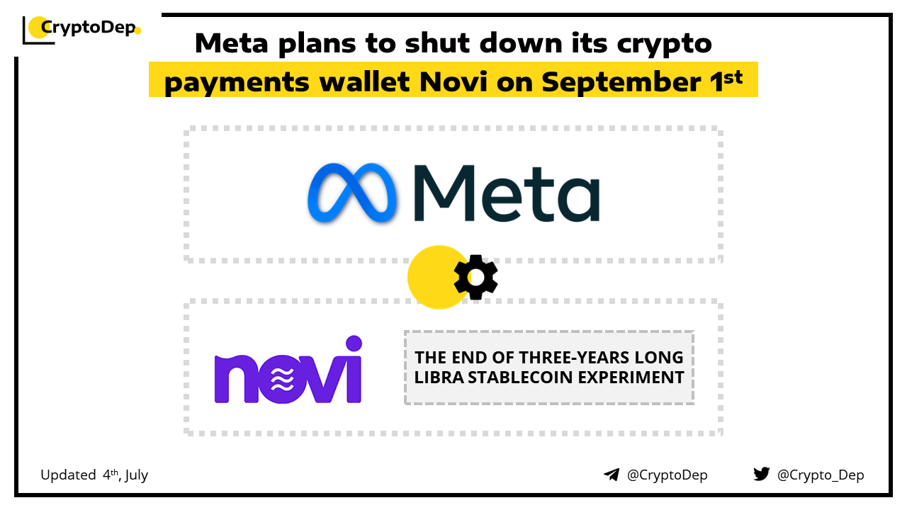 ππ» coindesk.com/business/2022/07/01/meta-to-shutter-novi-crypto-payments-wallet-in-september-ending-libra-saga/