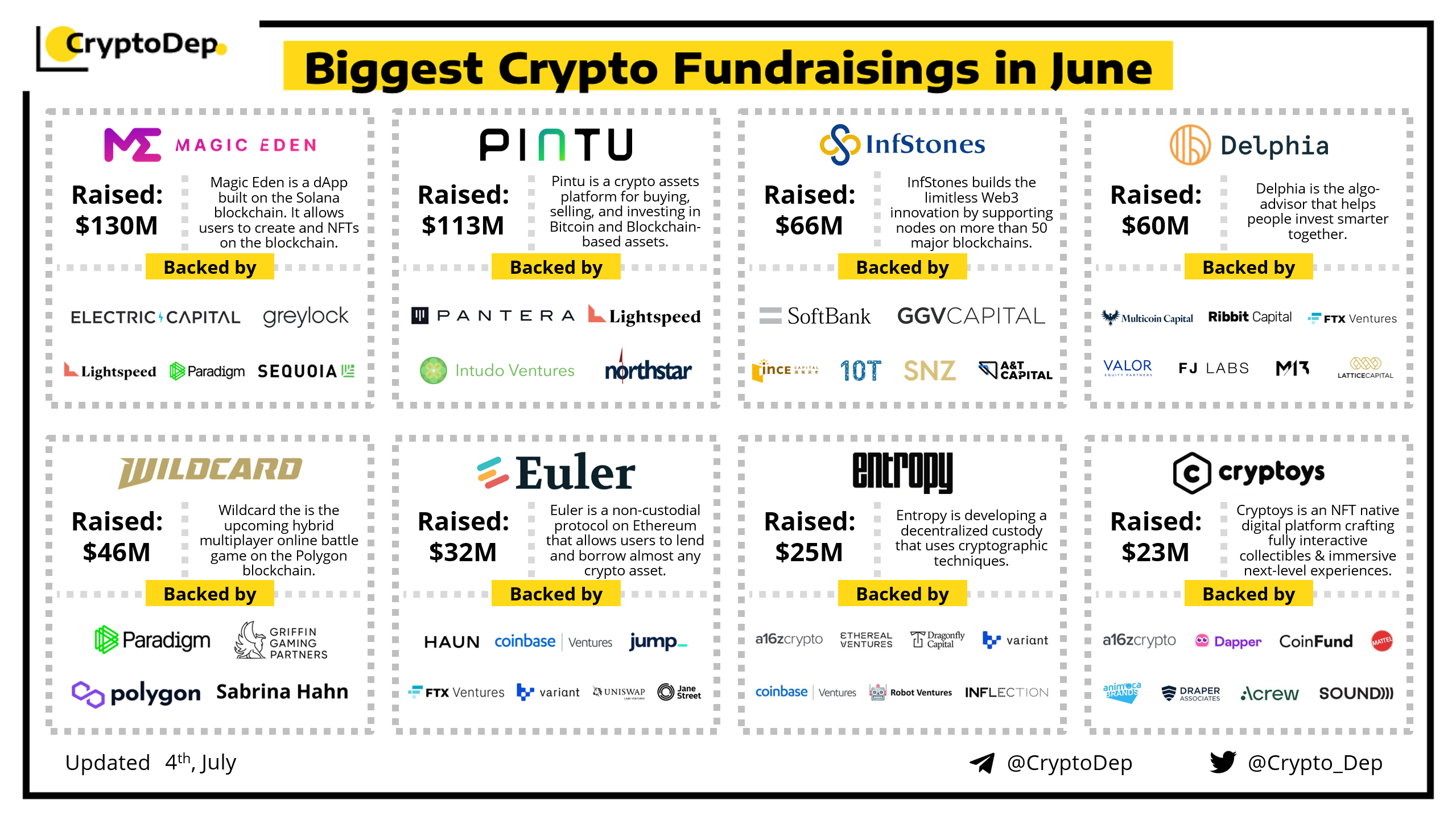 We are glad to present a list of the largest crypto fundraisings in June 2022. Despite the market being in a bear phase, many projects receive significant funding from major funds such as Coinbase Ventures, a16z, Sequoia, Paradigm, Pantera Capital, SoftBank, Animoca Brands, FTX Ventrures, and others.