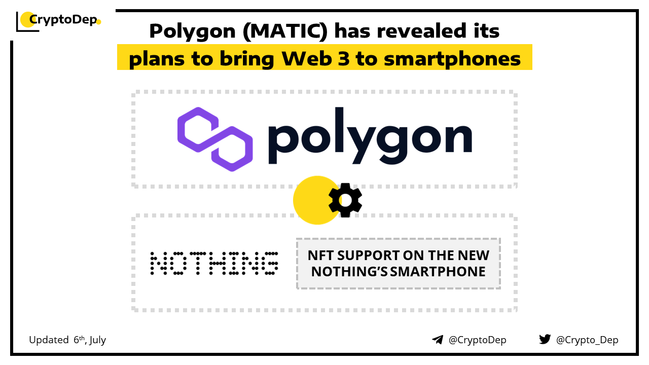 Polygon has partnered with tech startup Nothing to bring Web3 & offer NFTs on its new smartphone Nothing Phone. The NFT project - dubbed "Nothing Community Dots" - consists of airdropping tokens to Nothing community investors, which unlock perks such as early access to new products and events.
