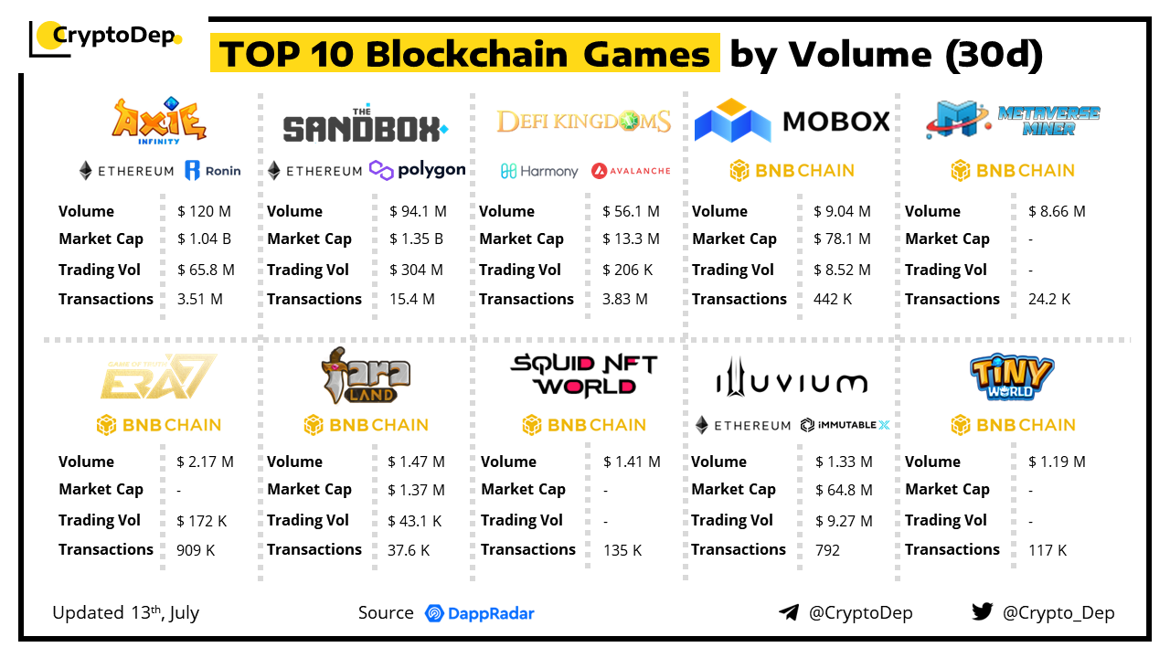 With the spread of Web3 technologies, blockchain games became the industry trend and keep on attracting the attention of gaming & crypto communities. We have made a recap of top blockchain games by volume in the last 30 days, so let's take a look!