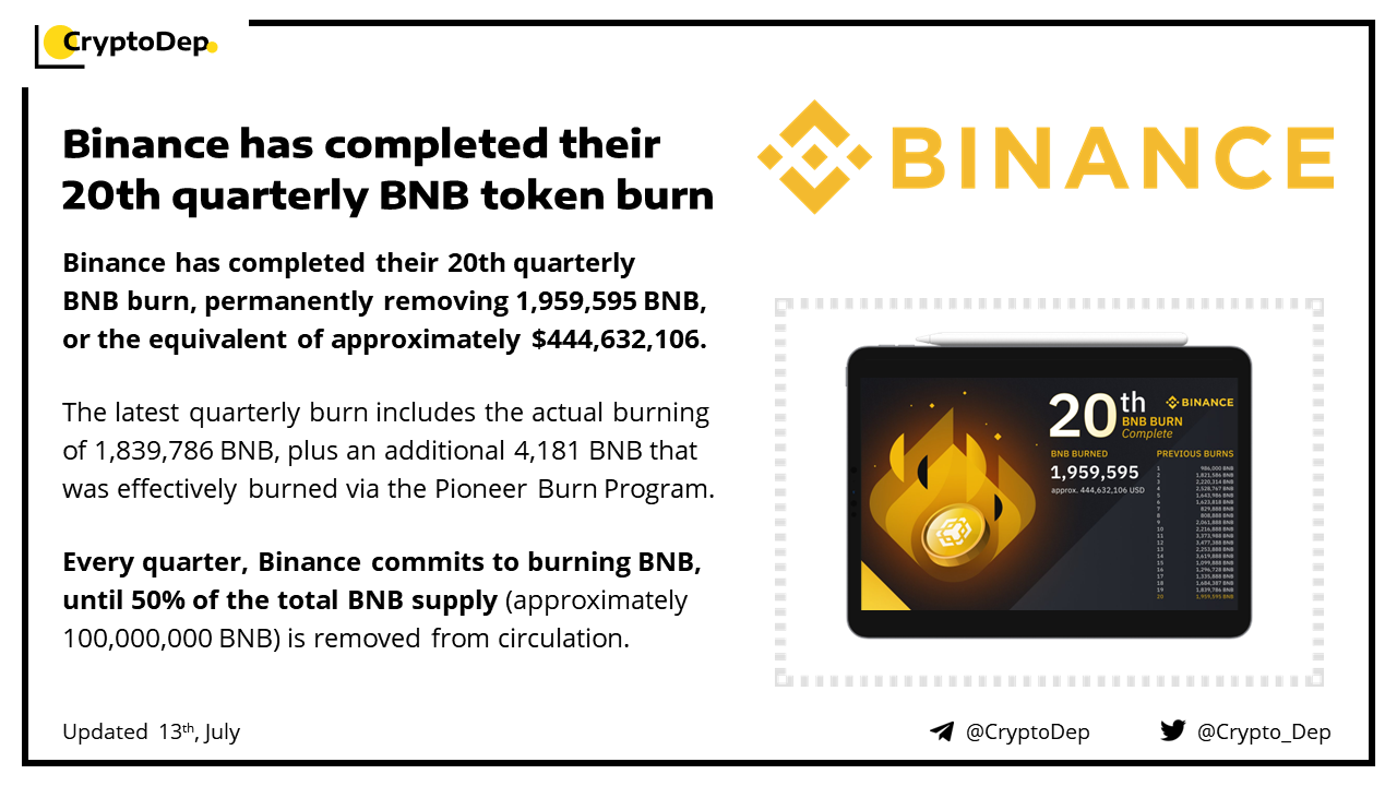 Binance has completed their 20th quarterly BNB burn, permanently removing 1,959,595 BNB, or the equivalent of approximately $444,632,106.