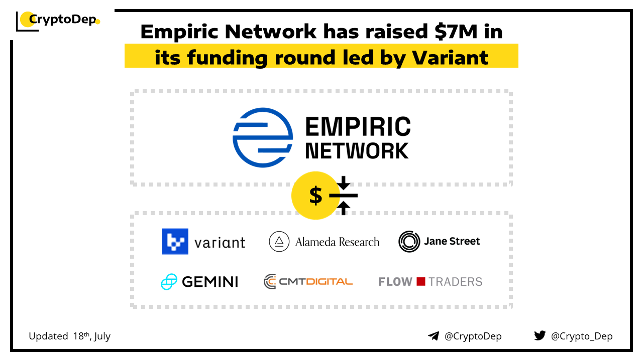 Empiric Network, a decentralized blockchain oracle on StarkNet, has announced the closure of the $7M funding round. The investment was led by Variant Fund, with additional participation from Alameda, CMT, Flow Traders, Gemini, Jane Street & ecosystem partners StarkWare, and Polygon co-founder Sandeep Nailwal, among others. The funding will be largely used toward hiring.