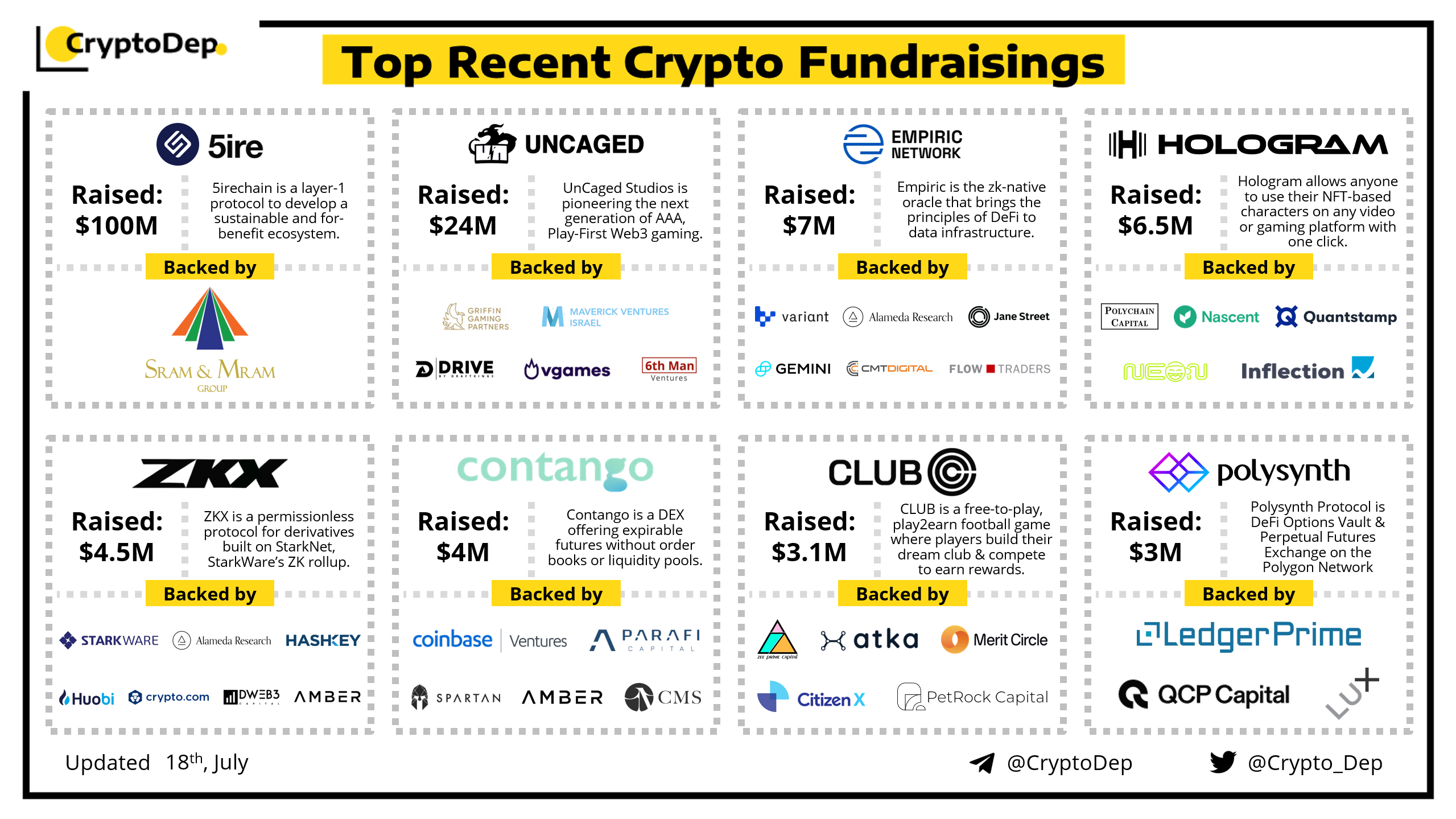 We are glad to present a list of the recent crypto fundraising events. Despite the market being in an unstable phase, many projects receive significant investments from major backers like Coinbase Ventures, Polychain Capital, Alameda Research, Variant Fund, Gemini, Spartan Group, Huobi, ะกrัptะพ.ัะพm, and others.