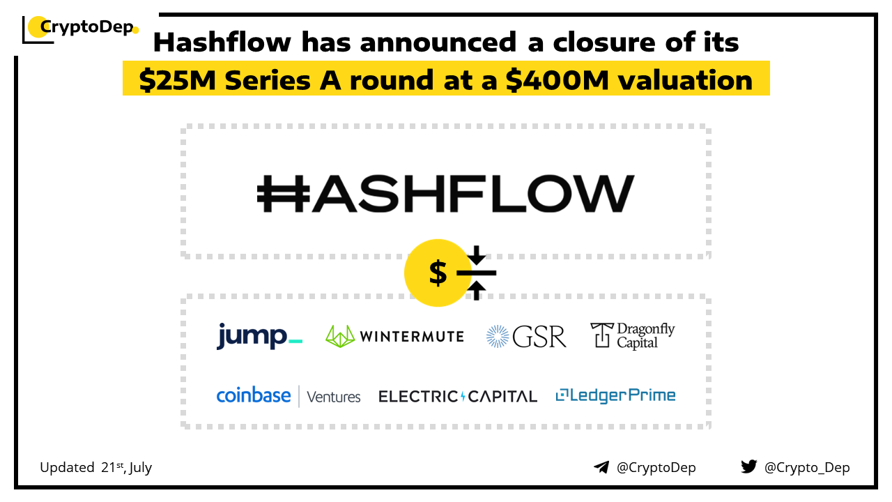 Hashflow, the DeFi trading platform, has raised $25M in a Series A funding. Among backers are Jump Crypto, Wintermute, GSR, LedgerPrime, Dragonfly Capita, Coinbase Ventures, Electric Capital, Altonomy, and other notable investors. The funds will be used to scale the product, grow the team and launch structured products.