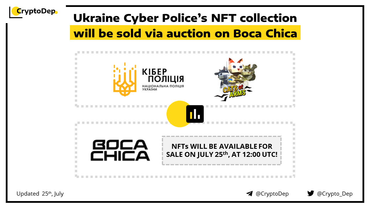 Ukraine Cyber Police will conduct the sale of its Cats at Arms NFT collection on Boca Chica today, at 12:00 UTC. This collection will be dedicated to the efforts of support to Ukraine and will also be the first government-backed NFT sale. Cats at Arms is a clicker-type game for both smartphones and desktop devices with play-to-earn mechanic that enables everyone whoโs playing the game to earn NFTs, points, and achievements by defeating in-game enemies.