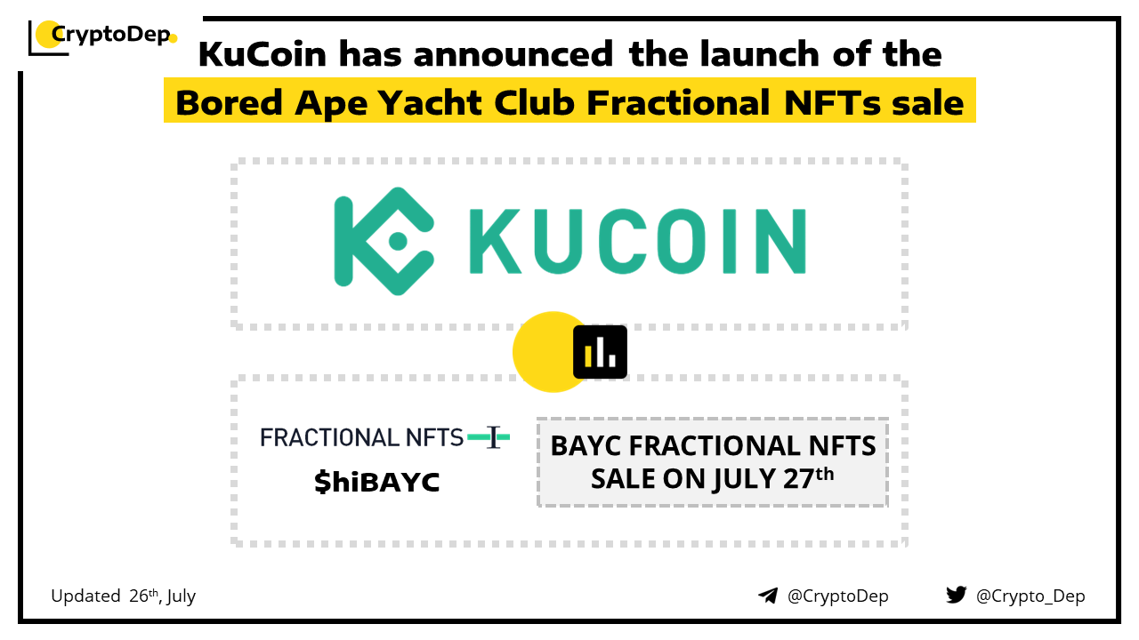 KuCoin to conduct its first project on KuCoin Fractional NFTs - hiBAYC. hiBAYC is an ERC-20 token representing 1/1,000,000 ownership of one BAYC in the collection vault. The subscription period will start on July 27th, at 10:00 AM UTC, and will be live till July 29th, 10:00 AM UTC.