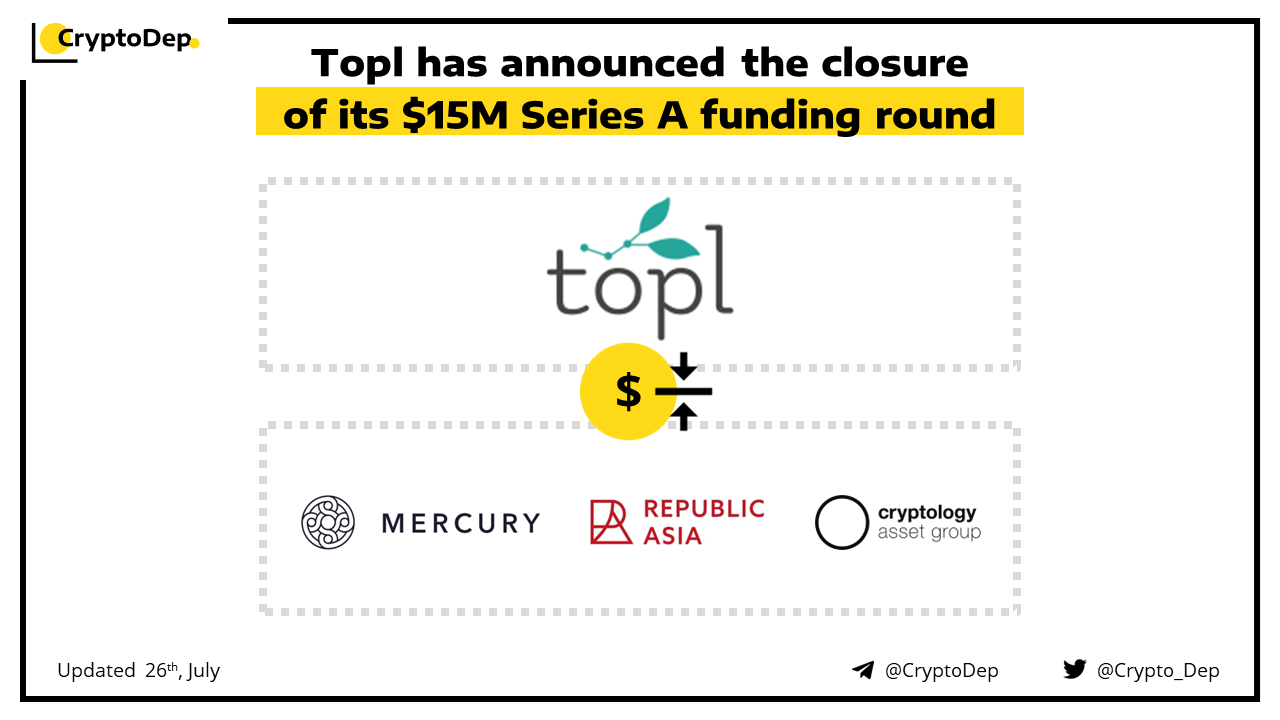 Topl, a blockchain ecosystem, has raised $15M in its Series A funding round led by Mercury, Republic Asia, and Cryptology Asset Group. Topl blockchain is decentralized protocol designed to unlock the next wave of inclusive, sustainable innovation across supply chains and markets. Toplβs blockchain protocol helps corporations track and tokenize their sustainability impact.