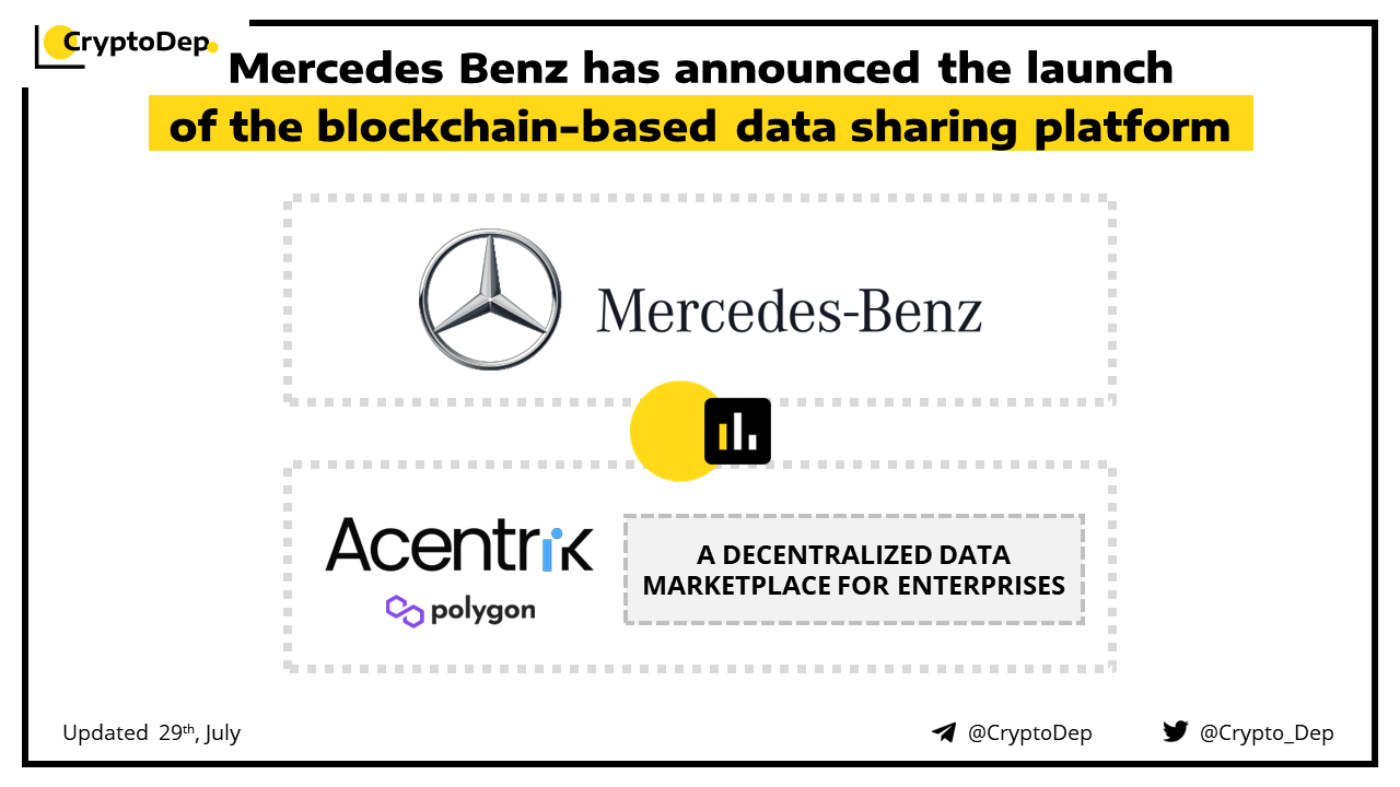 Mercedes Benz launches Acentrik blockchain-based data sharing platform. Acentrik is running on Polygon blockchain, squarely targeted at enterprise users & includes extensive access controls. The data is not stored on the blockchain, but an NFT represents each dataset and a metadata hash is stored with it.
