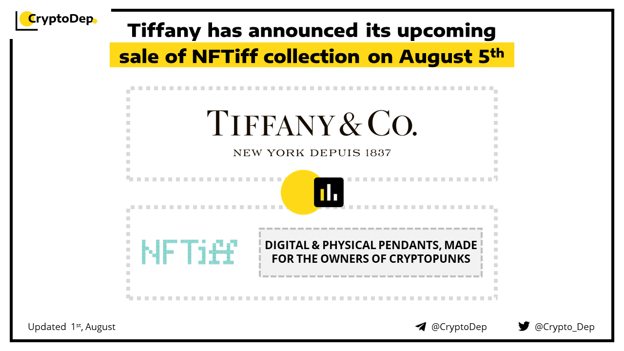 Tiffany, luxury jewelry and specialty retailer will conduct the sale of its NFTiff collection on August 5th. NFTiff consists of 250 NFT pieces for 30 $ETH each. The offering would be a series of digital and physical pendants, made for the owners of Cryptopunks that would resemble the NFTs they already own.