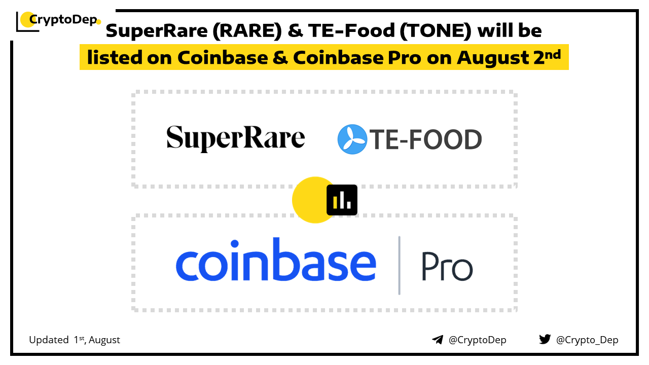 ββSuperRare (RARE) & TE-Food (TONE) will be listed on Coinbase & Coinbase Pro on August 2nd