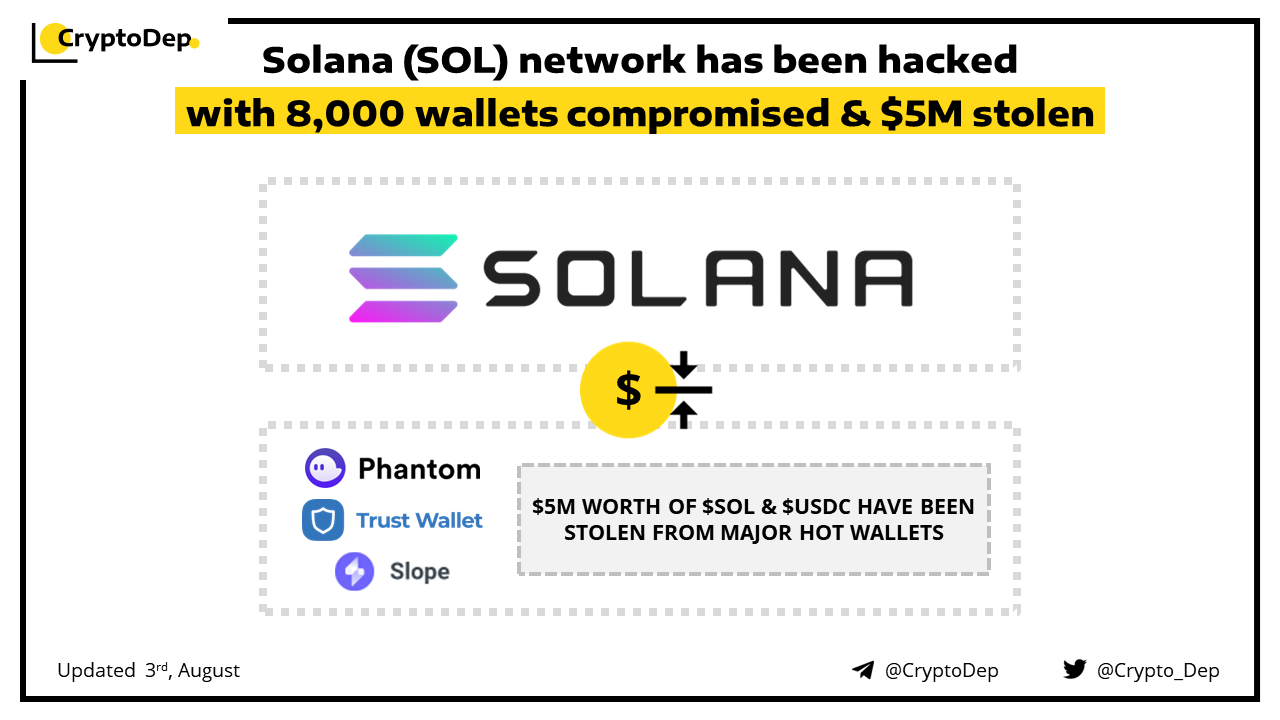 Solana network has been exposed to a massive hack leading to the theft of $5M worth of $SOL, $USDC, and other Solana-based tokens from unsuspecting users. Funds drained from major hot wallets including Phantom, Trust Wallet & Slope Wallet, the attacker somehow obtained the ability to sign transactions on the behalf of users.