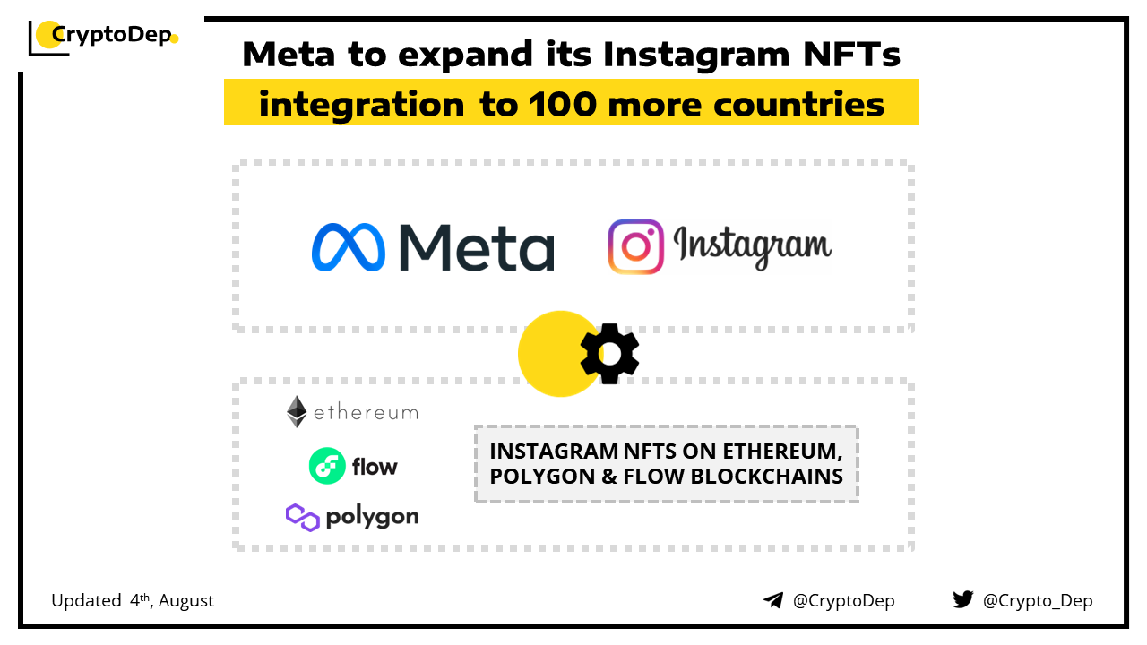 Meta has announced the expansion of digital collectibles offering on Instagram to 100 more countries and support blockchains including Ethereum, Polygon, and Flow. Users can connect a digital wallet to Instagram via Rainbow, MetaMask, Trust Wallet, or Coinbase Wallet. Users can post NFTs as their profile picture like on Twitter.