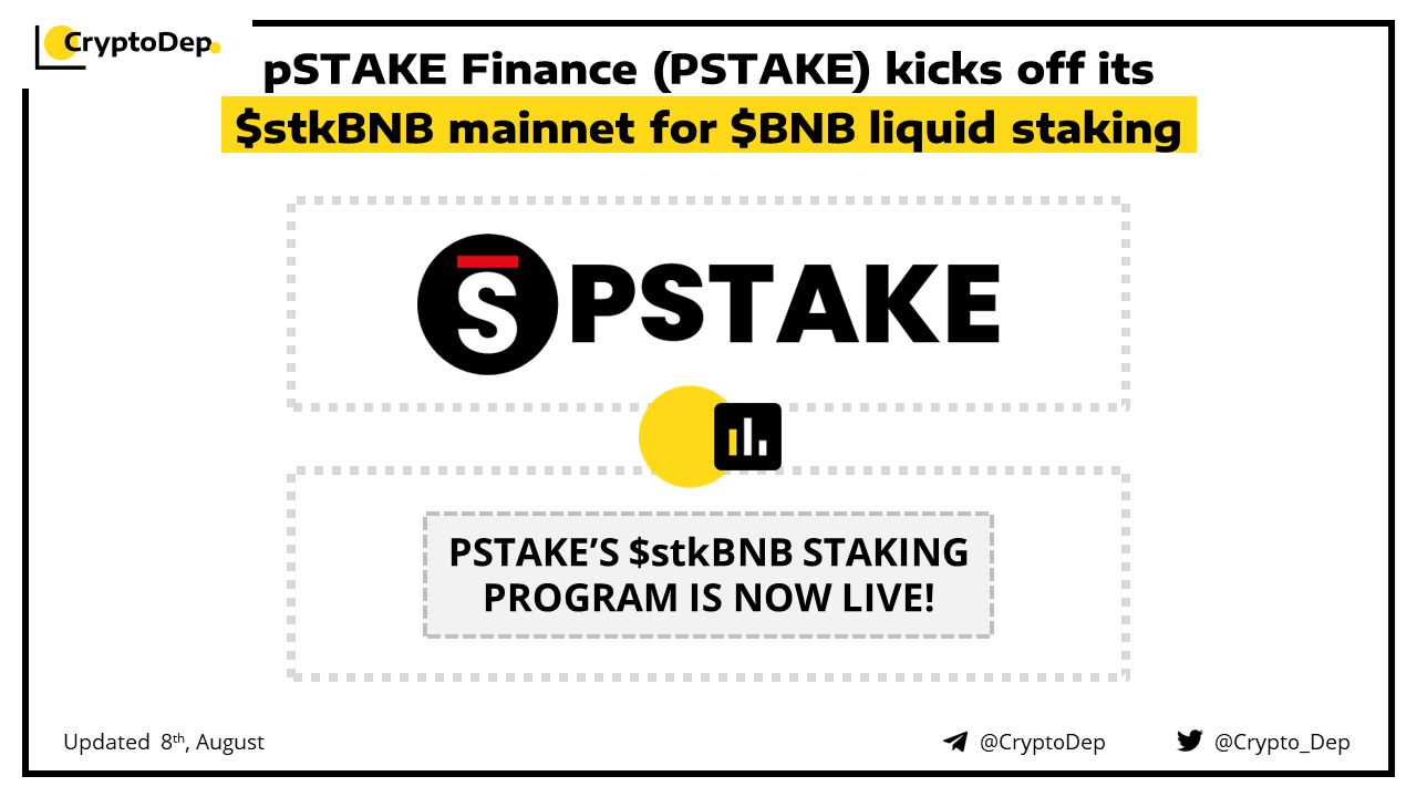 pSTAKE Finance's stkBNB mainnet is now live! With this launch, users are now able to earn DeFi yields by liquid staking their $BNB! From now on, stakers will be able to directly mint stkBNB by depositing assets on the pSTAKE platform. Newly-minted assets can be used across BNB Chainβs DeFi ecosystem to generate additional yield.