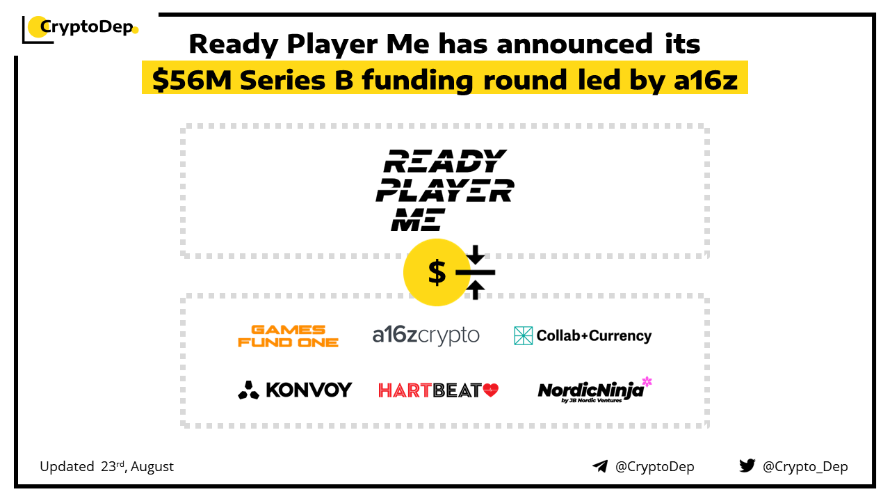 Ready Player Me has raised $56M in the Series B investment round. The funding was led by a16z GAMES FUND ONE and a16z crypto with participation from Collab Currency, Endeavor, Kevin Hartβs Hartbeat Ventures, DβAmelio family, Punk6529, Snowfro, Nordic Ninja, Konvoy and others. The funding will help Ready Player Me to scale up the team from 51 people and to establish the financial stability for the unpredictable markets ahead.