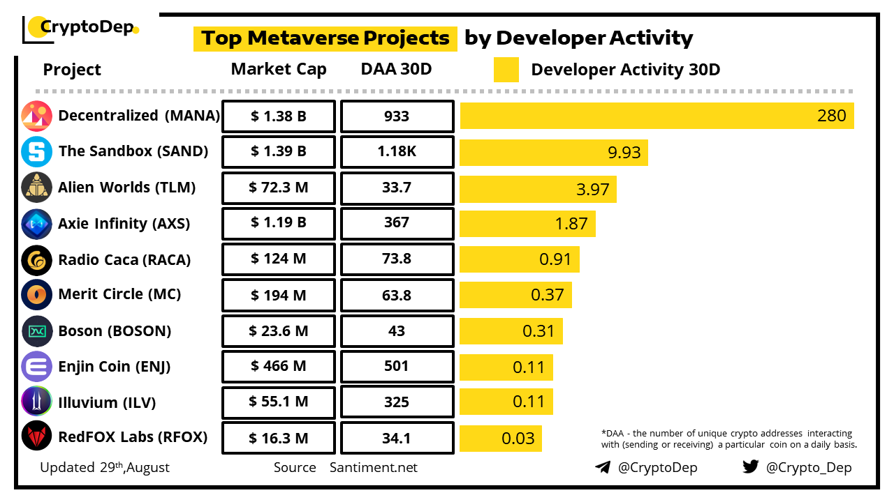 Dev.Activity - the development activity of a project done in its public Github repositories. Development Activity metrics are measured in a number of Github events.