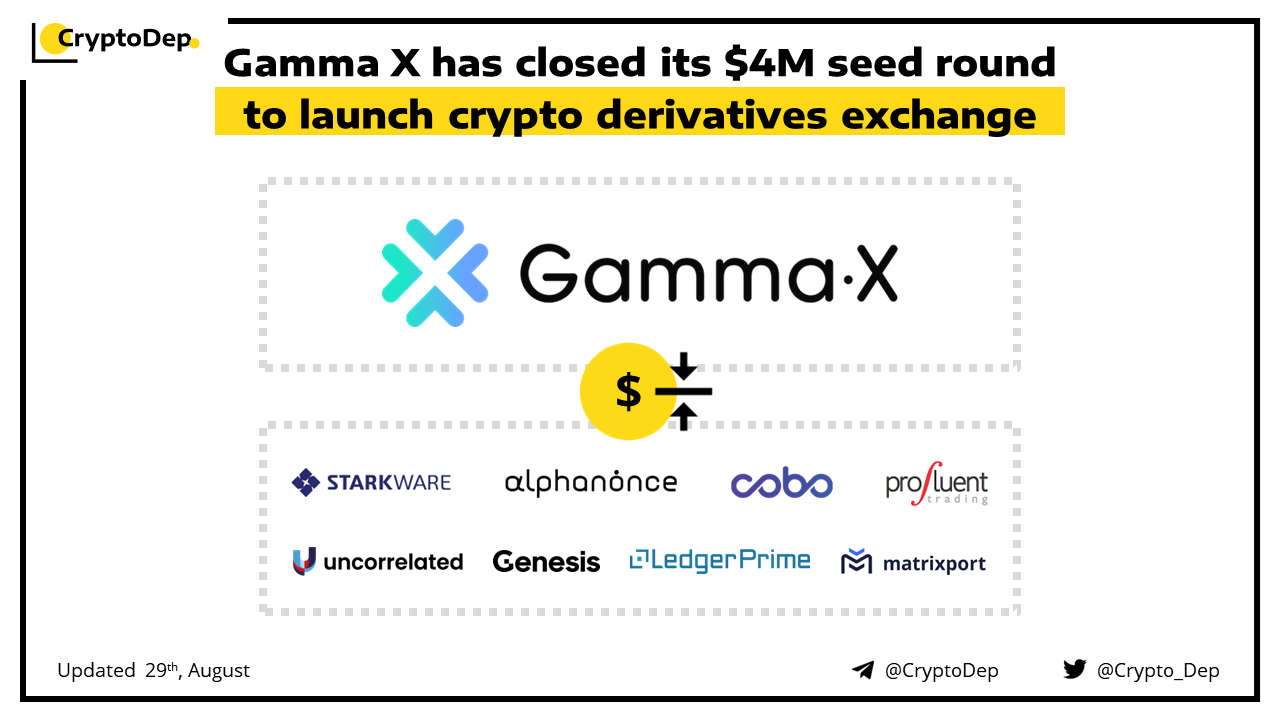 Gamma X has announced the closure of its $4M seed investment round, backed by the likes of StarkWare. Other investors in the round include Alphanonce, Cobo, Genesis Trading, Kyber, Ledger Prime, Matrixport, Profluent, Uncorrelated, and 01Node. Gamma X is a company building a new high-performance hybrid crypto derivatives exchange.
