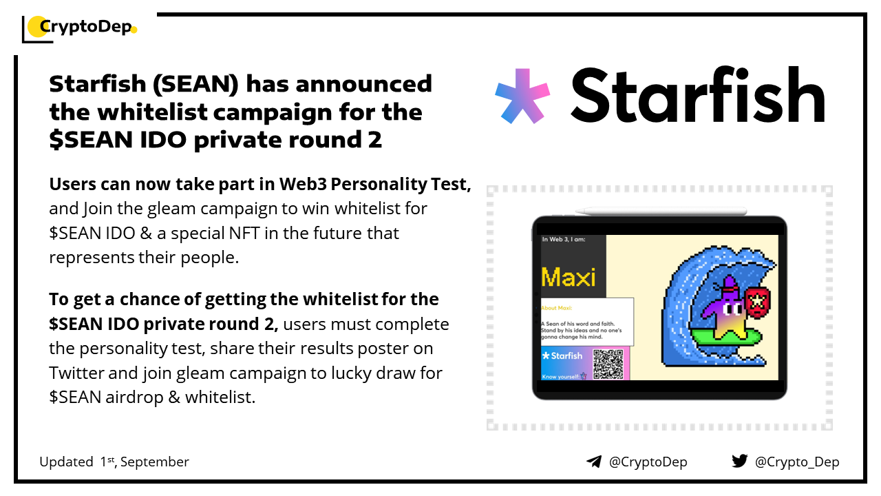 Users can now take part in Web3 Personality Test, and Join the gleam campaign to win whitelist for $SEAN IDO & a special NFT in the future that represents their people. To get a chance of getting the whitelist for the $SEAN IDO private round 2, users must complete the personality test, share their results poster on Twitter and join gleam campaign to lucky draw for $SEAN airdrop & whitelist.