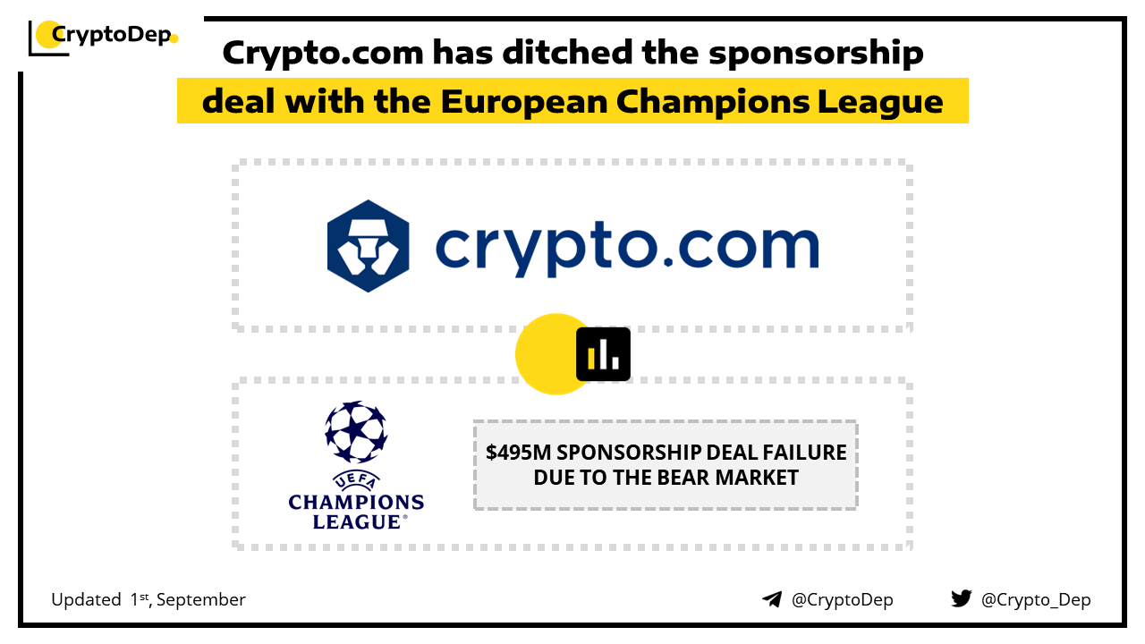 Crypto.ัะพm, a major crypto exchange has pulled out of negotiations on $495M sponsorship deal with European Champions League (UEFA), citing unfavorable market conditions. The deal was expected to run for five seasons and would have cost the crypto exchange roughly 100M euros per season, or $99M. However, Crypto.ัะพm has continued to venture into sports partnerships, signing a deal to sponsor the FIFA World Cup this year.