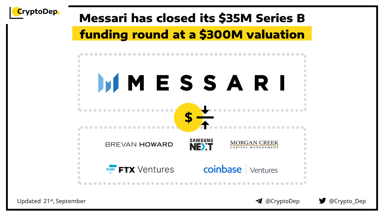 Messari, a crypto data and analytics company, has raised $35M in the Series B funding round led by Brevan Howard Digital. Additional investors include Morgan Creek Digital, Samsung Next, FTX Ventures and Coinbase Ventures. The company will use new funding to expand internationally, invest in new data offerings and tools that complete their market-leading product suite.
