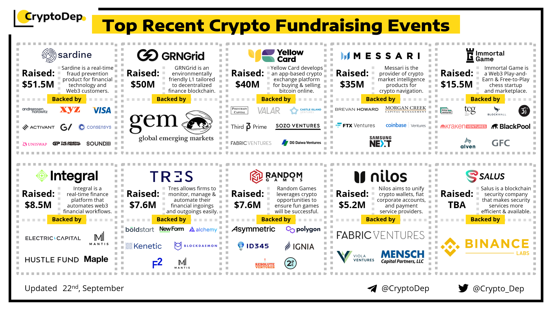 We are excited to present a list of some recent crypto fundraising events, backed by well-known investors such as Andreessen Horowitz, VISA, ConsenSys, Uniswap Labs, Polychain Capital, FTX Ventures, Coinbase Ventures, Electric Capital, Kenetic Capital, Alchemy, Binance Labs, Polygon, Fabric Ventures, and others. Let's take a look!