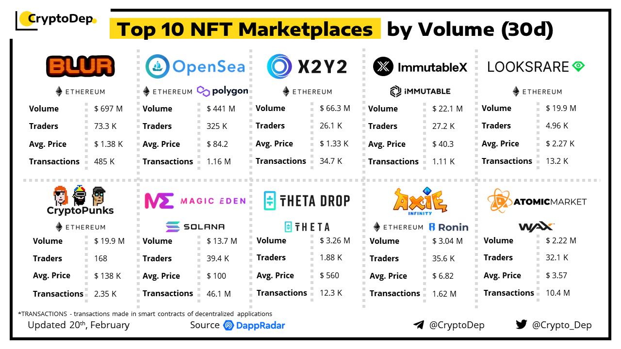 An NFT marketplace is a digital platform for buying and selling NFTs. Let's take a look at some of the best-performed NFT marketplaces by volume in the last 30 days, according to the data from DappRadar.