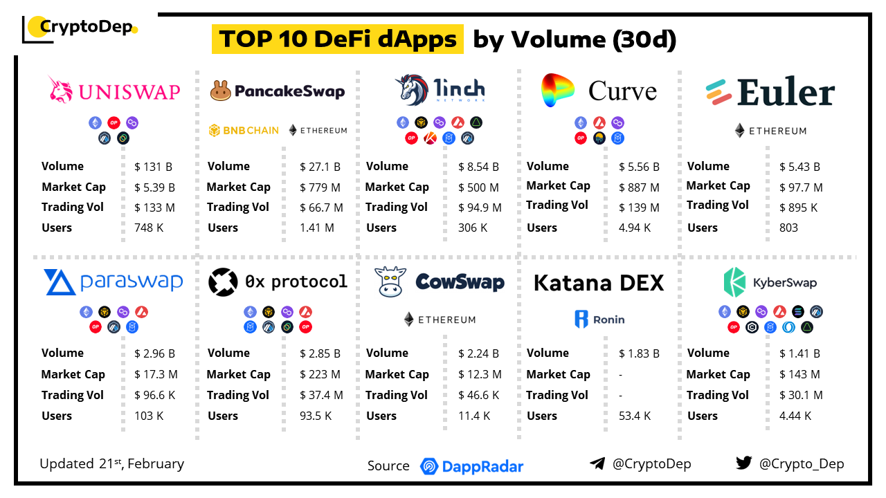 A decentralized application (dApp) is a program built on blockchain that combines a smart contract and a front-end user interface. We present the top DeFi dApps by volume in the last 30 days, regardless of the protocol's chain. Data taken from DappRadar.