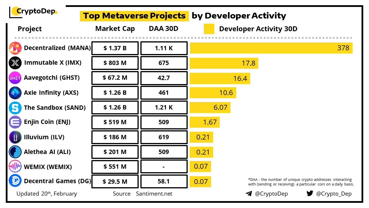 Dev.Activity - the development activity of a project done in its public Github repositories. Development Activity metrics are measured in a number of Github events.