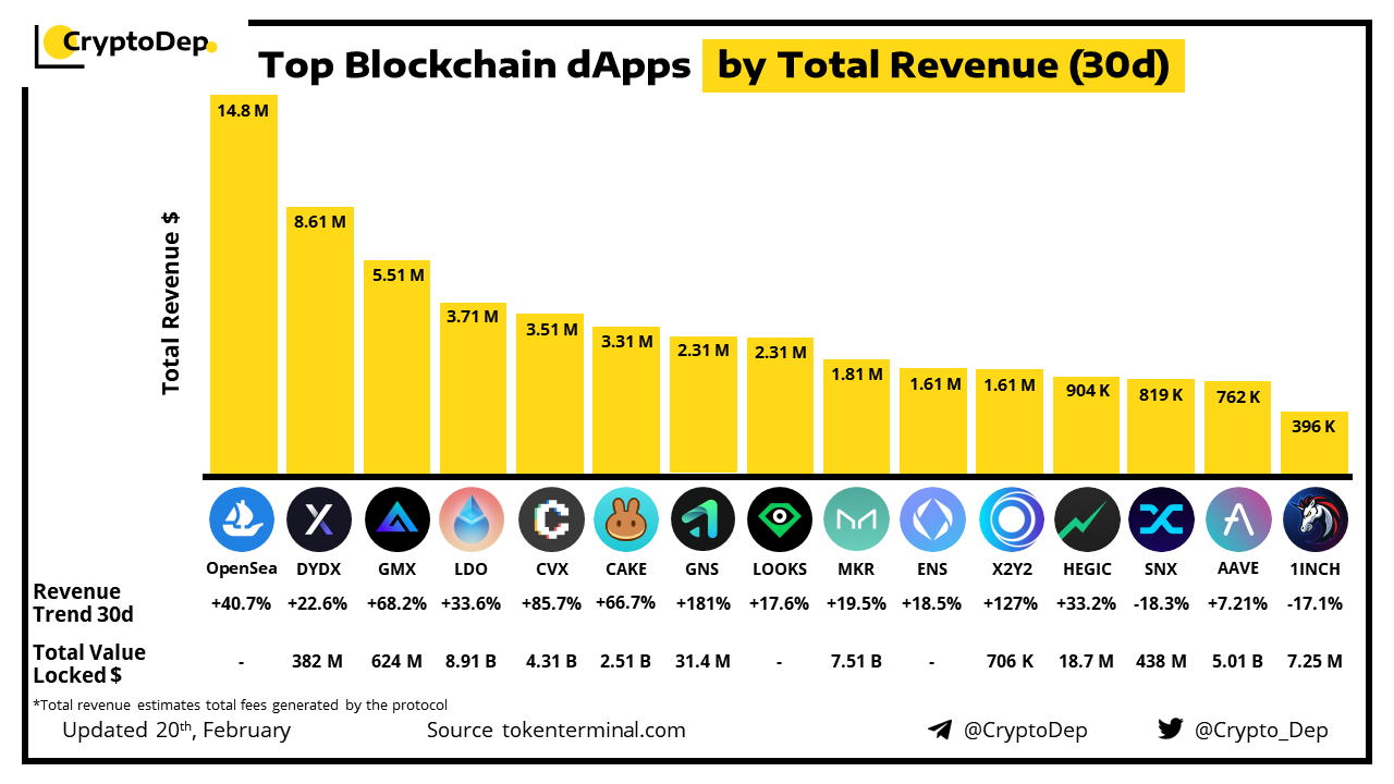 Decentralized applications (dApps) operate on a blockchain network and have gained popularity in recent years. In this post, we analyze the data from Token Terminal and rank the top blockchain dApps by total revenue in the last 30 days, to understand which dApps are generating the most income and why.